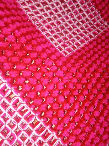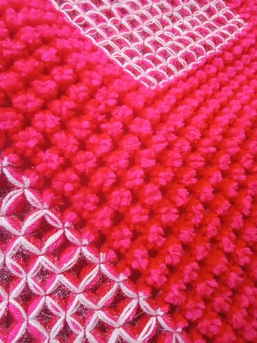 - Material: yun iplik (çəhrayı-qırmızı tonlarda), metalik parlaqlıq verən nazik ipliklə bəzəklənmiş