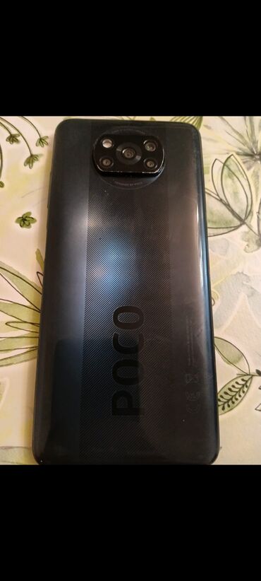 POCO smartfon - Model: POCO X3 (seriyası) – arxa tərəfdə POCO loqosu və dairəvi kamera bloklu dizayn - Ekran: böyük tam ekran, mərkəzdə ön kamera (punch‑hole). Ekranda “Kilidi açmaq üçün sürüşdürü...