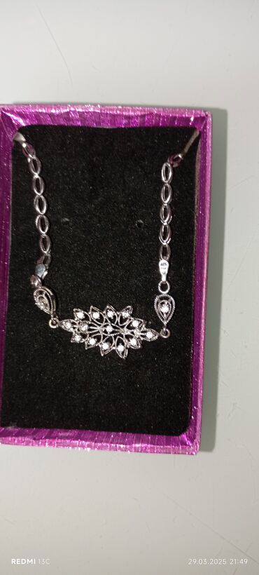 Gümüşü rəngli, zərif dizaynlı qolbaq. Qolbağın mərkəzində parlaq daşlarla bəzədilmiş çiçək formalı element yerləşir. Qolbaq zəncirvari toxunuşla hazırlanmışdır və müxtəlif tədbirlər və ya gündəlik istifadə üçün uyğundur.