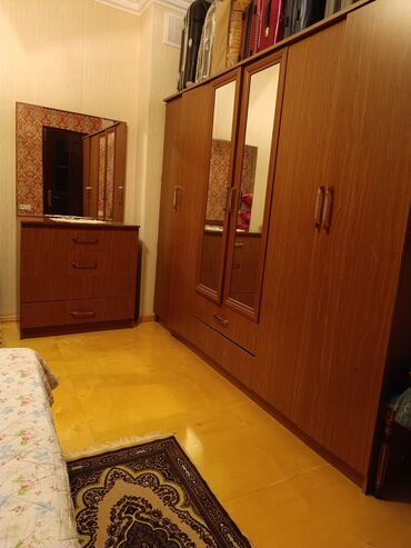 - Geniş 4 qapılı dolab: orta qapılarda güzgü, aşağıda uzun çekmece, içi asılqan və rəflərlə.