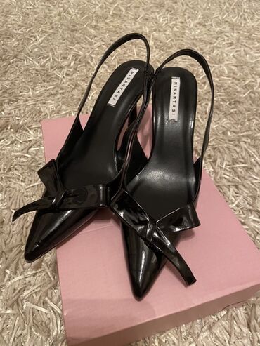 Qadın yüksək daban ayaqqabısı - Rəng: parıltılı qara (laklı səth), içlik parlaq çəhrayı - Model: sivri burun, arxadan açıq “d’Orsay” kəsim - Daban: nazik stilet, təxminən 9–10 sm - Bağlama: bilək ...