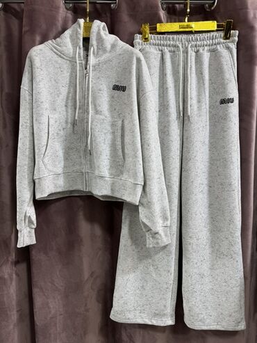 - Üst geyim: kapüşonlu, ön tam fermuarlı hoodie. İki ədəd ön “kenguru” cib, kapüşon üçün iplər, elastik manjet və bel xətti. Sol döş hissəsində kiçik “miu” yazısı.